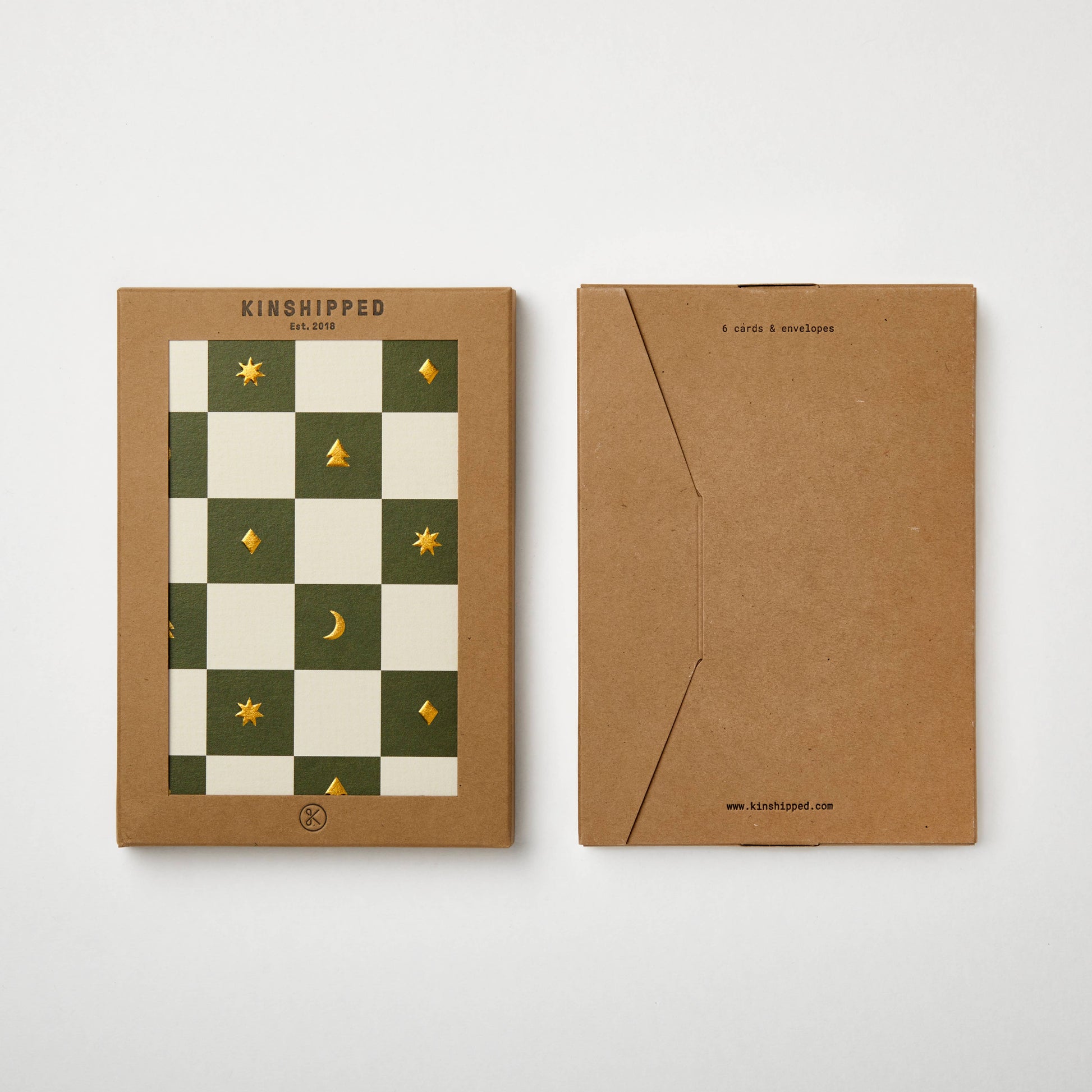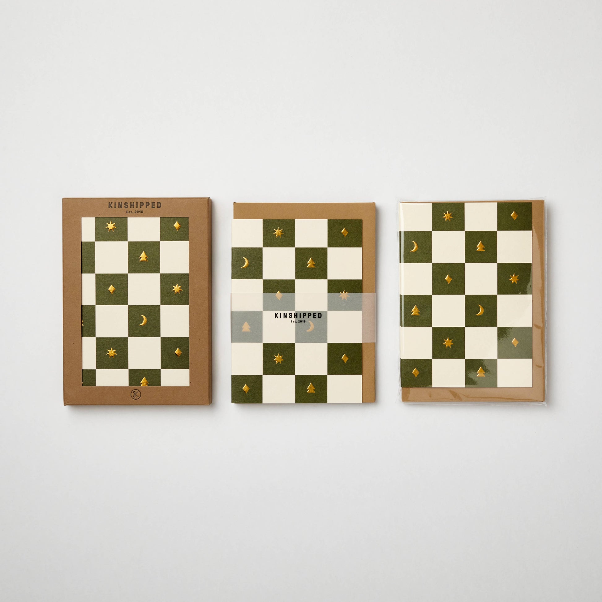 Beautiful moss-green checkerboard cards, embossed in gold seasonal icons complete with luxury envelopes. There is no copy on the outside leaving the words for the sender.