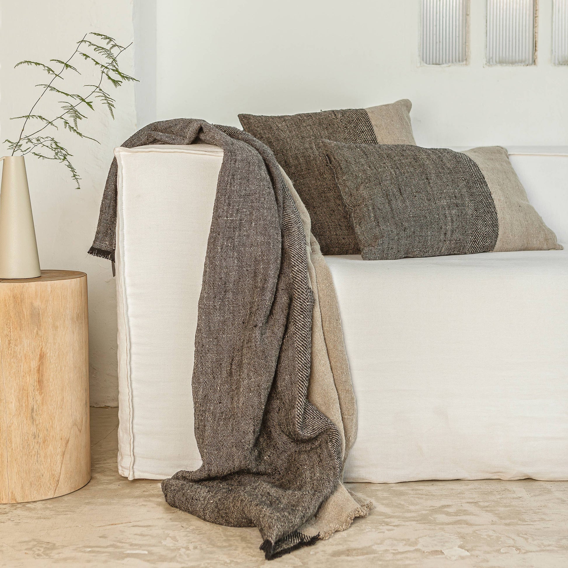 Daddal cushion cover features a two-tone design, with two thirds of the surface woven in black linen and a herringbone stripe.
