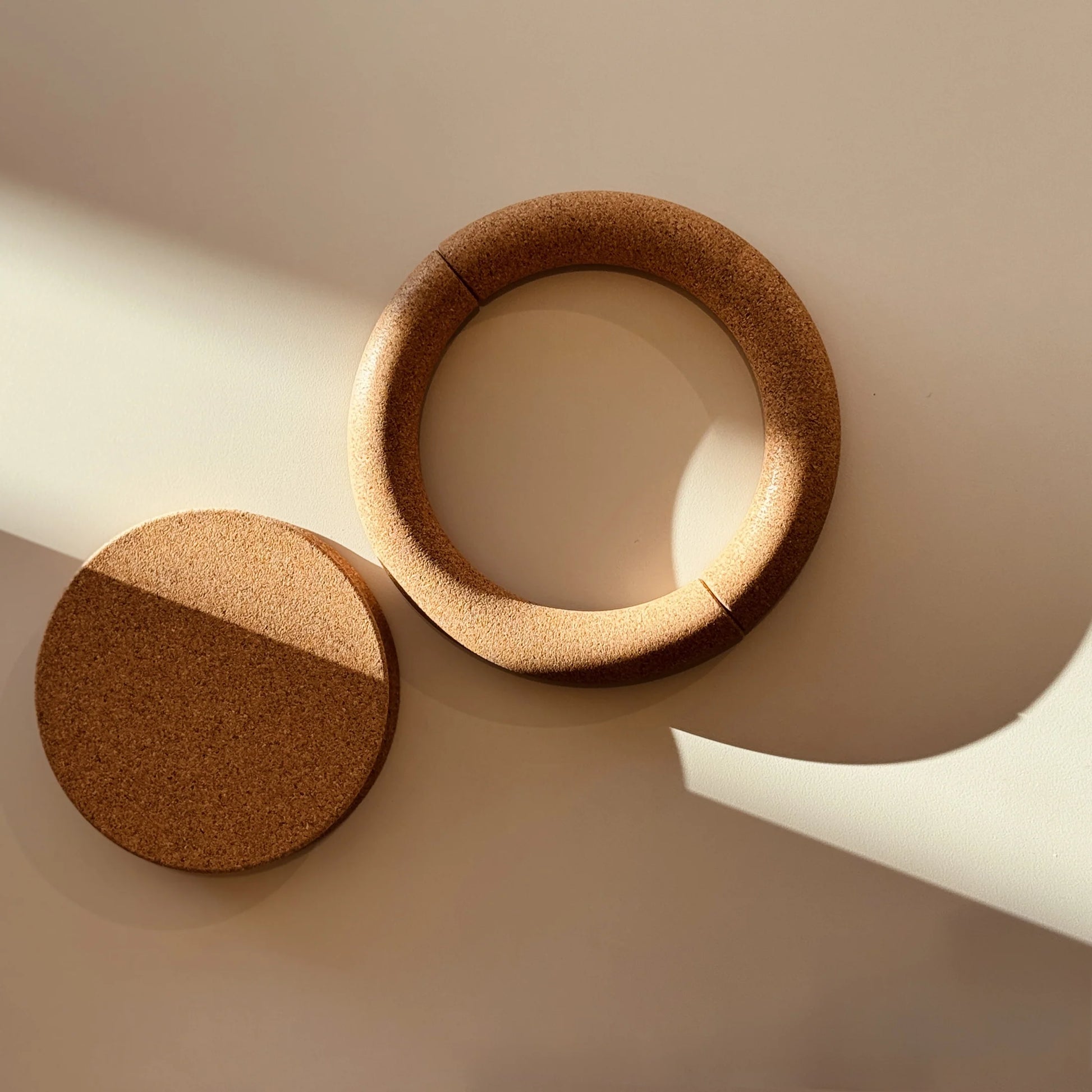 This trivet is sustainably crafted from durable, heat-resistant cork and can be taken apart and reassembled in various different configurations. The second trivet wraps halo-like around the inner piece, affixed with magnets to form a handy two-in-one design.