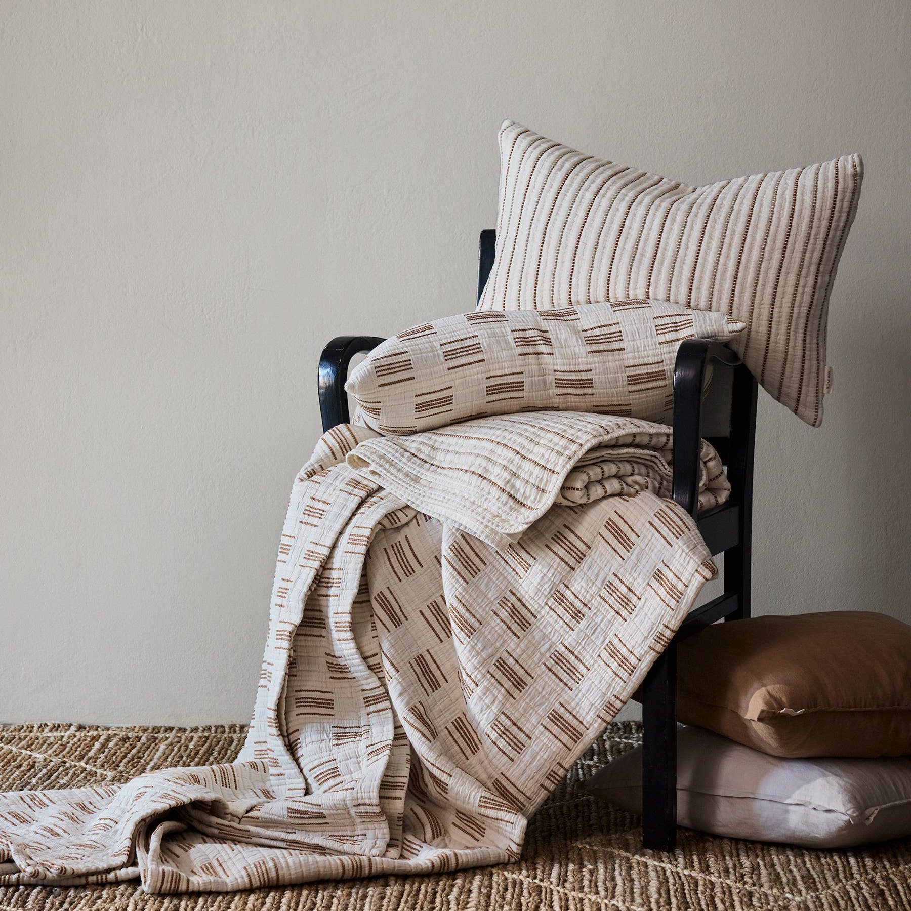'Julien' Bedspread features beautifully woven light brown stripes, with a sewn 4.5 cm wide hem all around. The weaving technique of the fabric gives the bedspread an elegant striped pattern