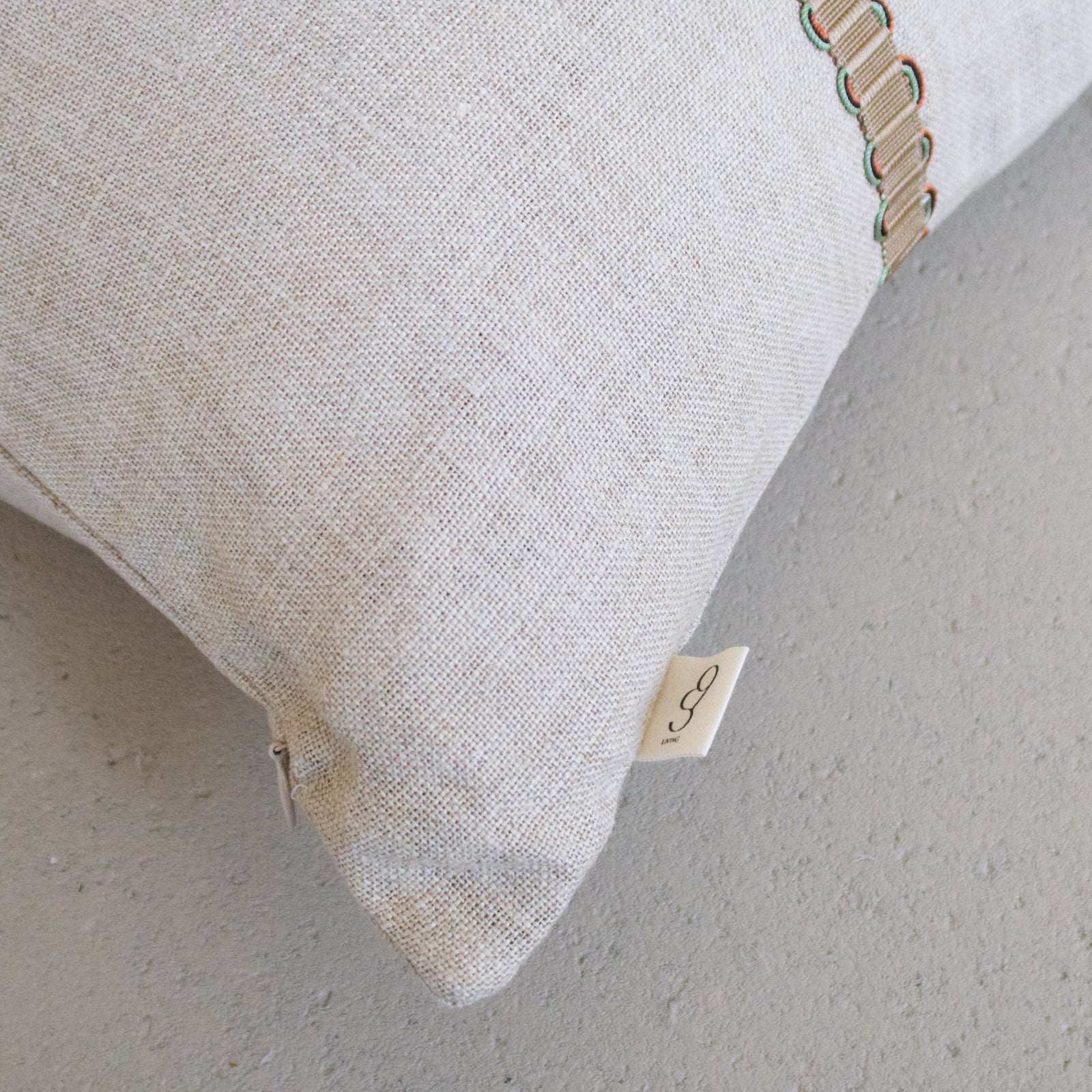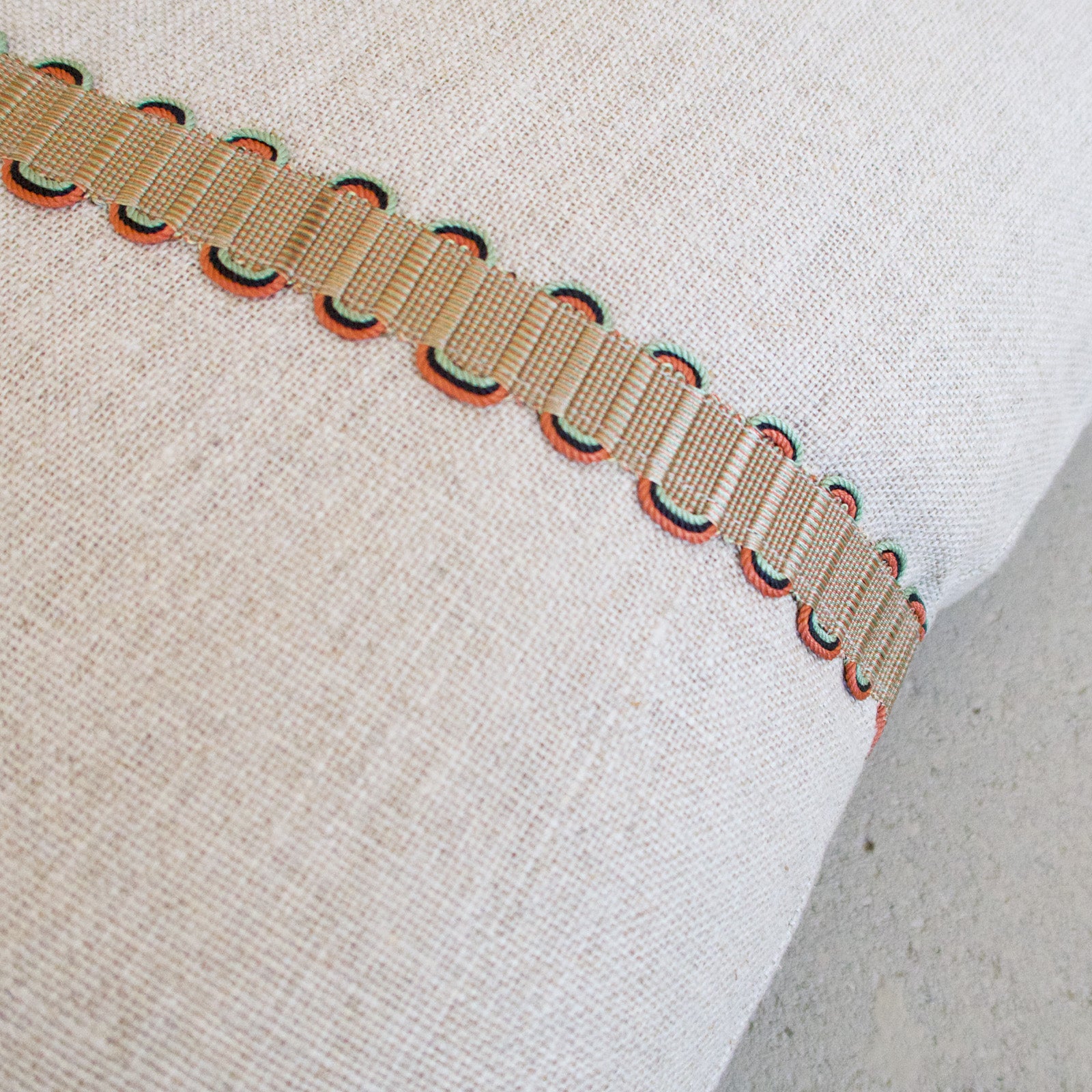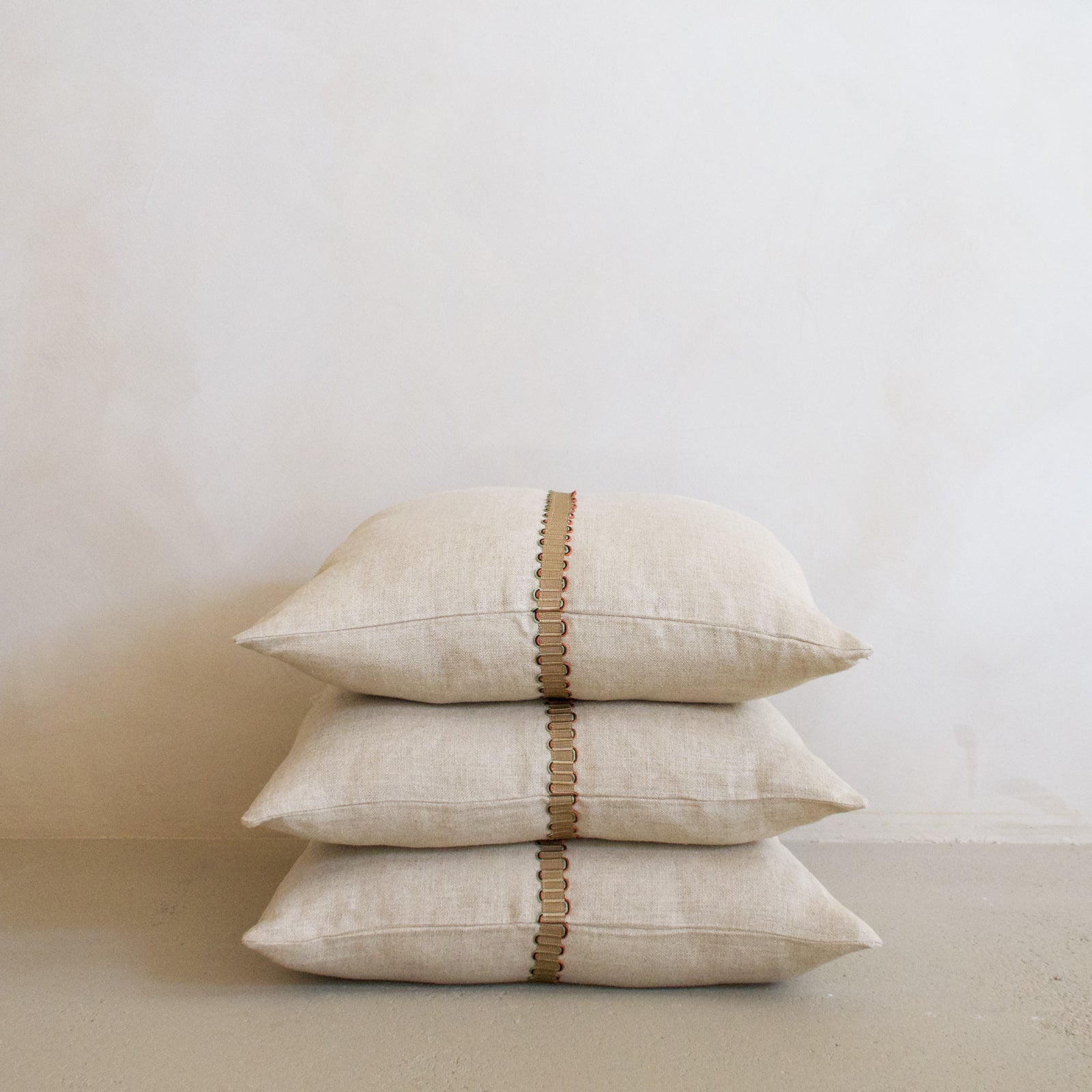 A linen cushion front and back with a detailed trim around the centre of the cushion. Filled with an ethically sourced feather and down pad.