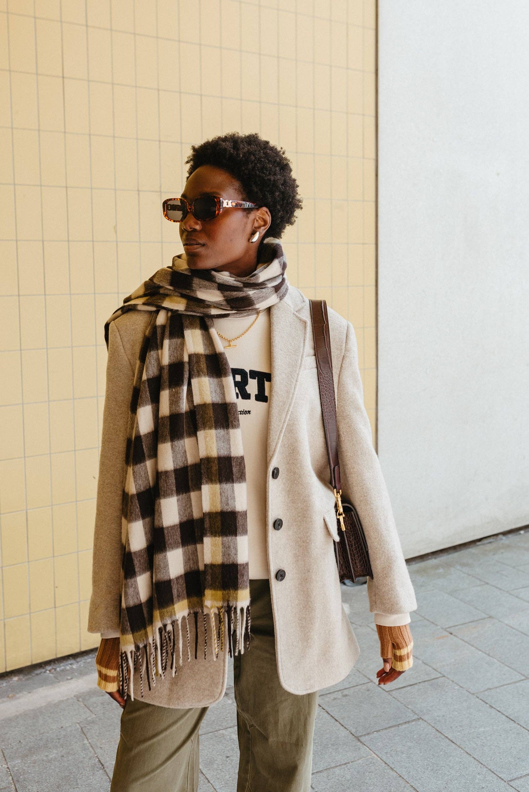 Features dark chocolate brown, lime green and grey. It's woven from soft and thermo-regulating lambswool for optimised comfort and warmth