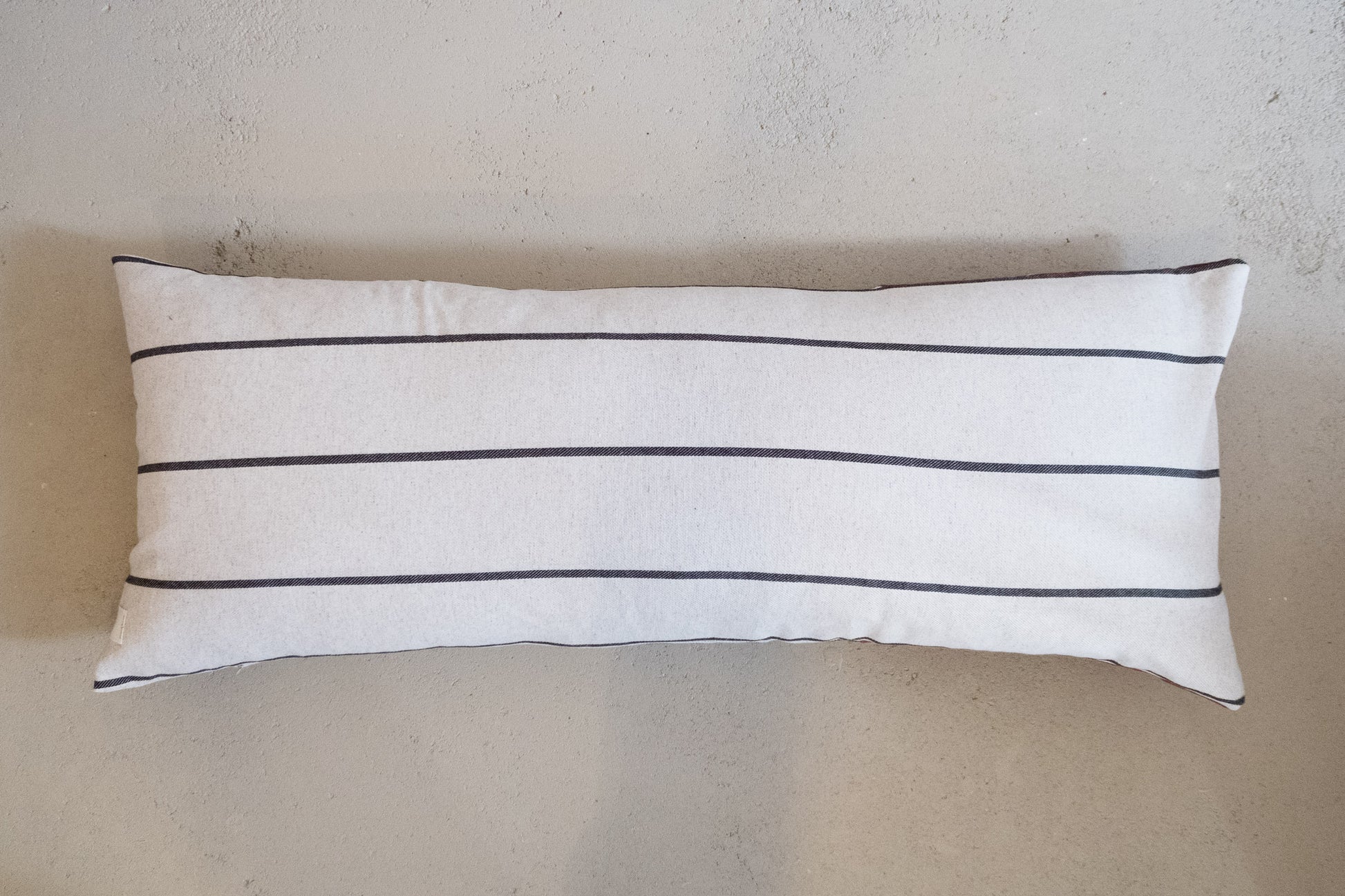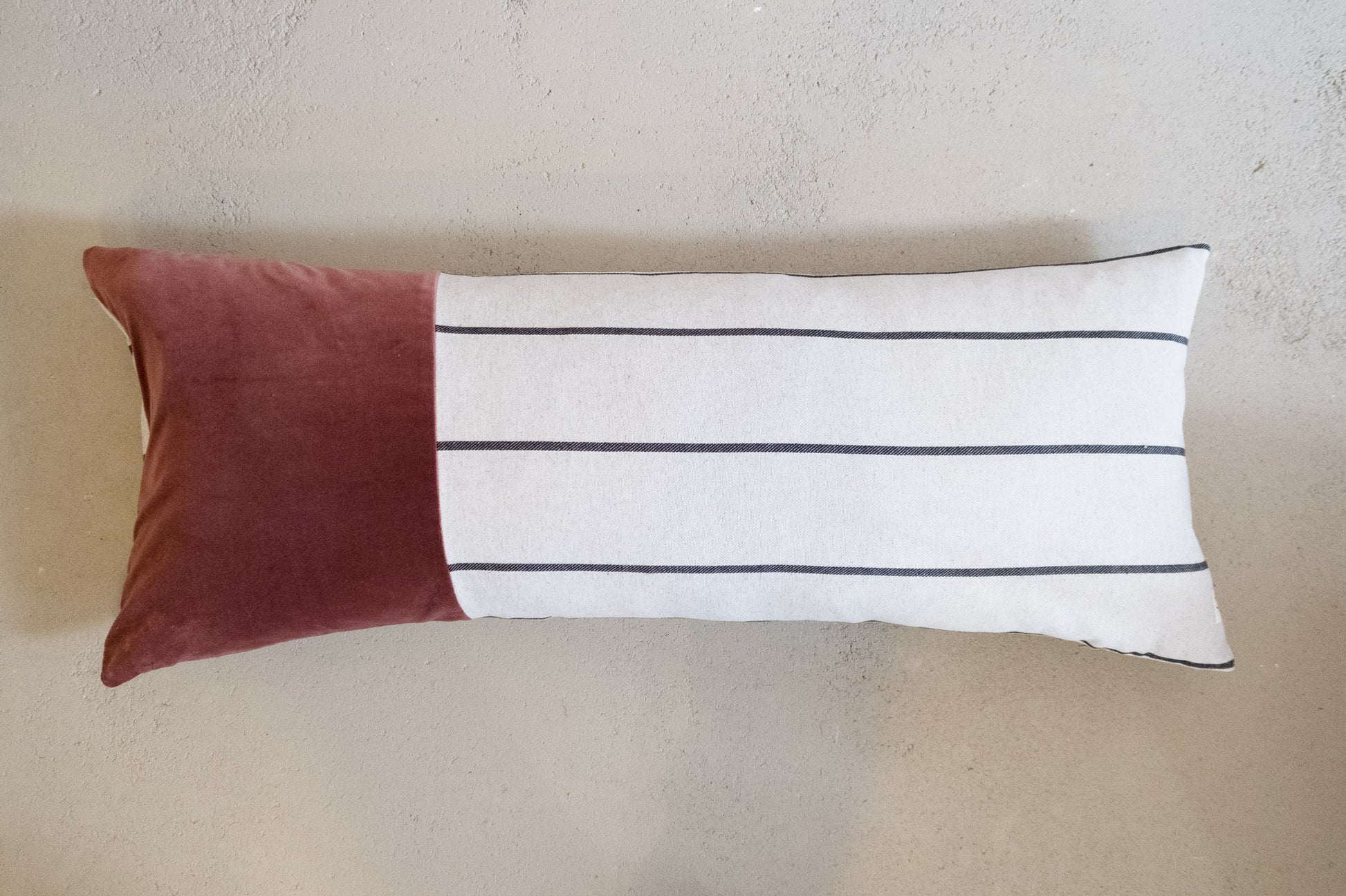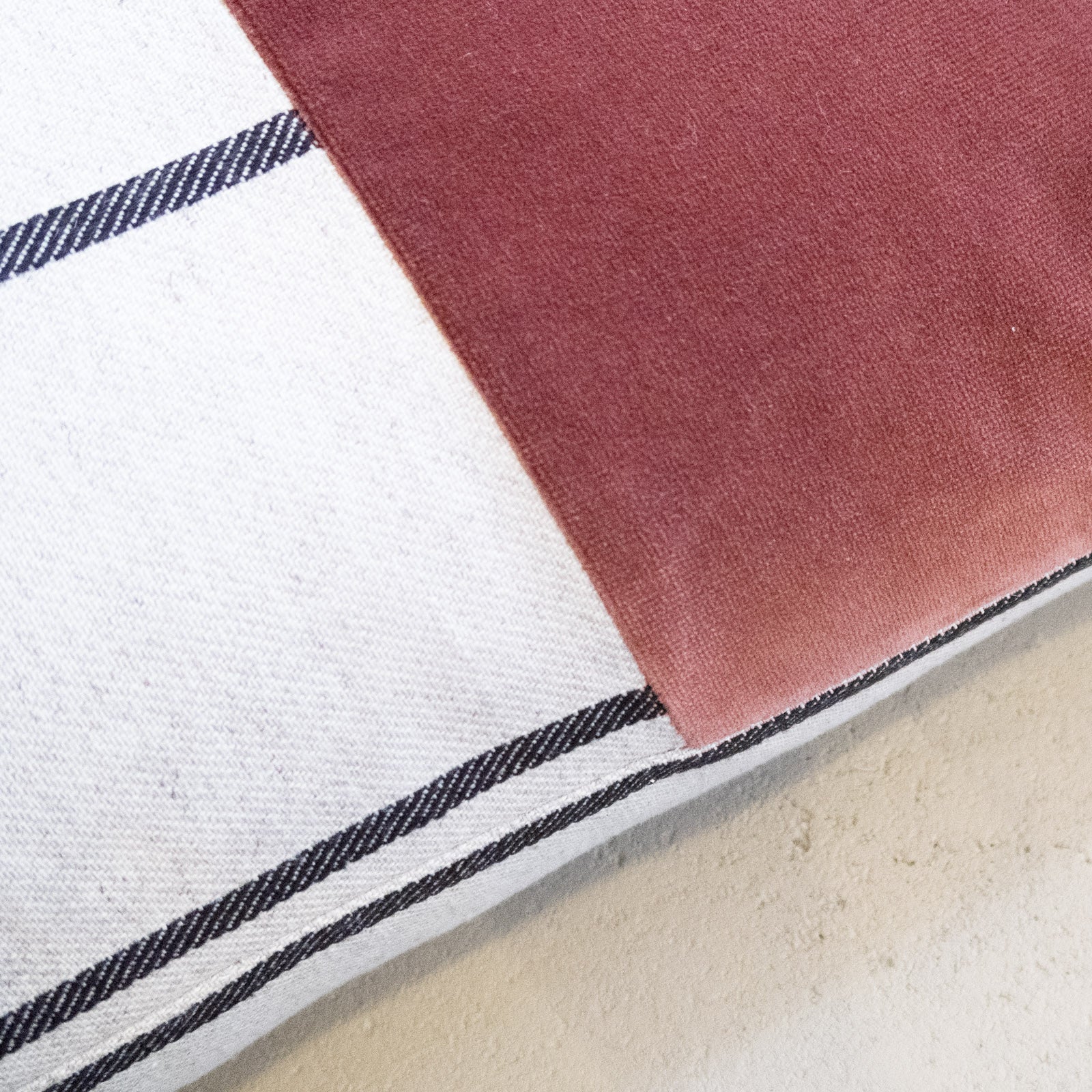 Organic striped linen and velvet panelled cushion. These super versatile cushions can be thrown on a bed, used as scatter cushions, or to soften bench seating. Filled with an ethically sourced feather and down pad.