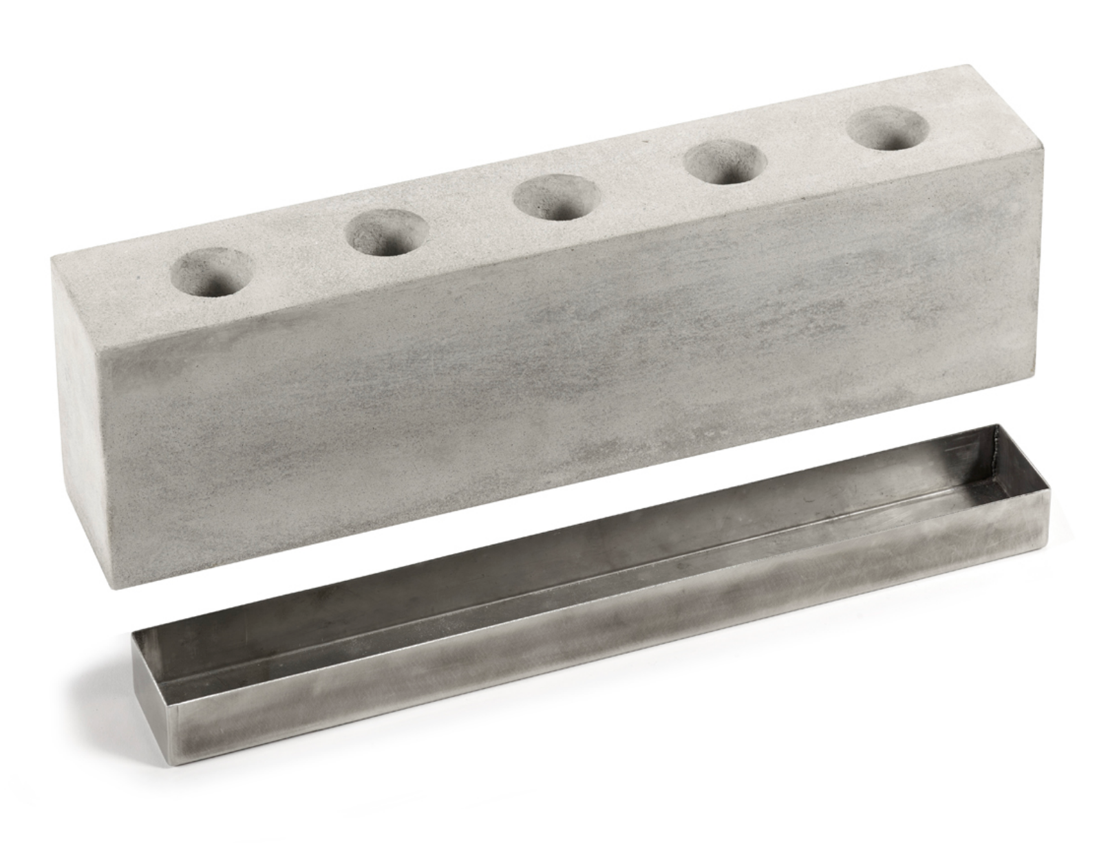 A stylish and practical concrete and stainless steel umbrella stand. The holes are drilled at 30 degrees, so all the umbrellas point in the same direction which elevates it to become a sculptural piece