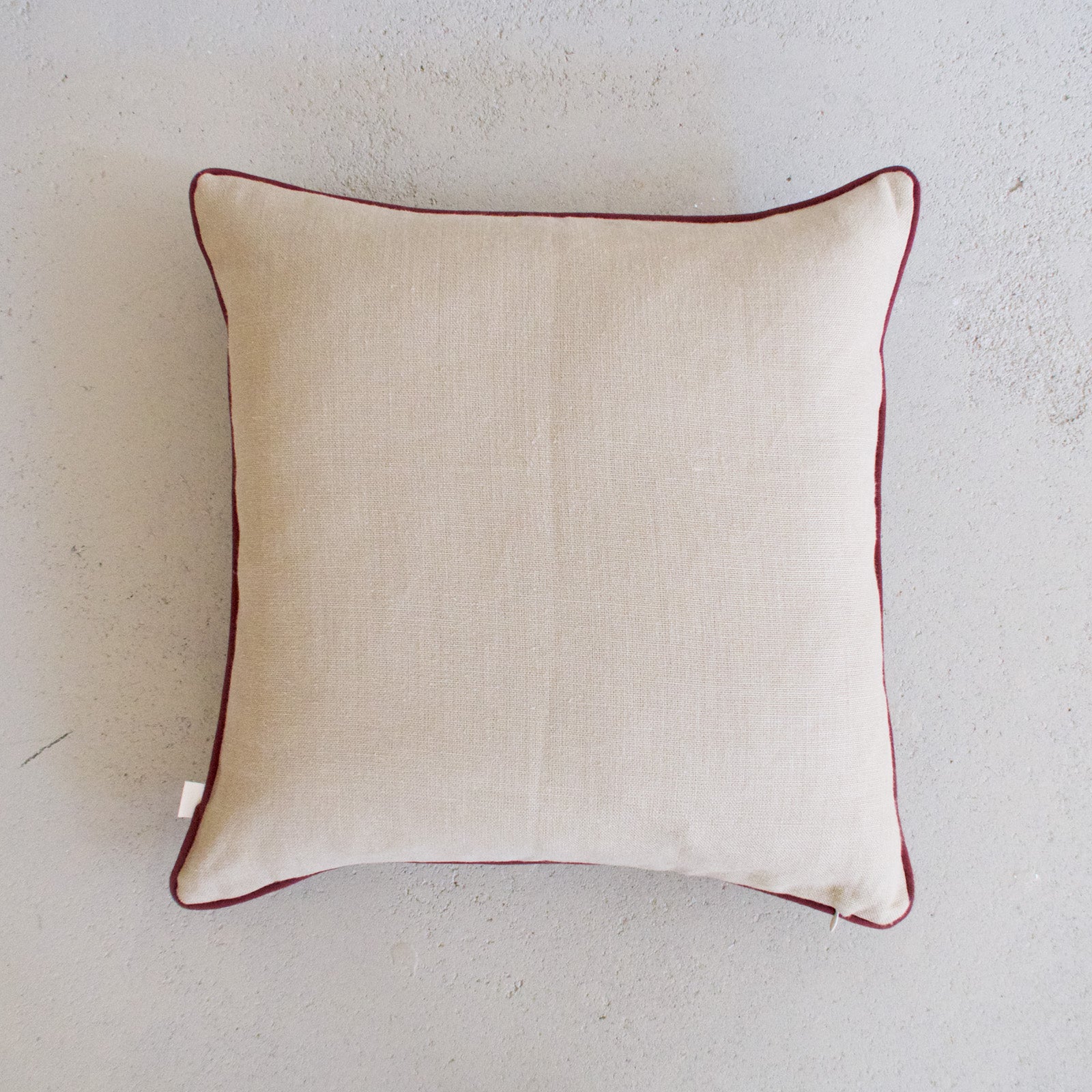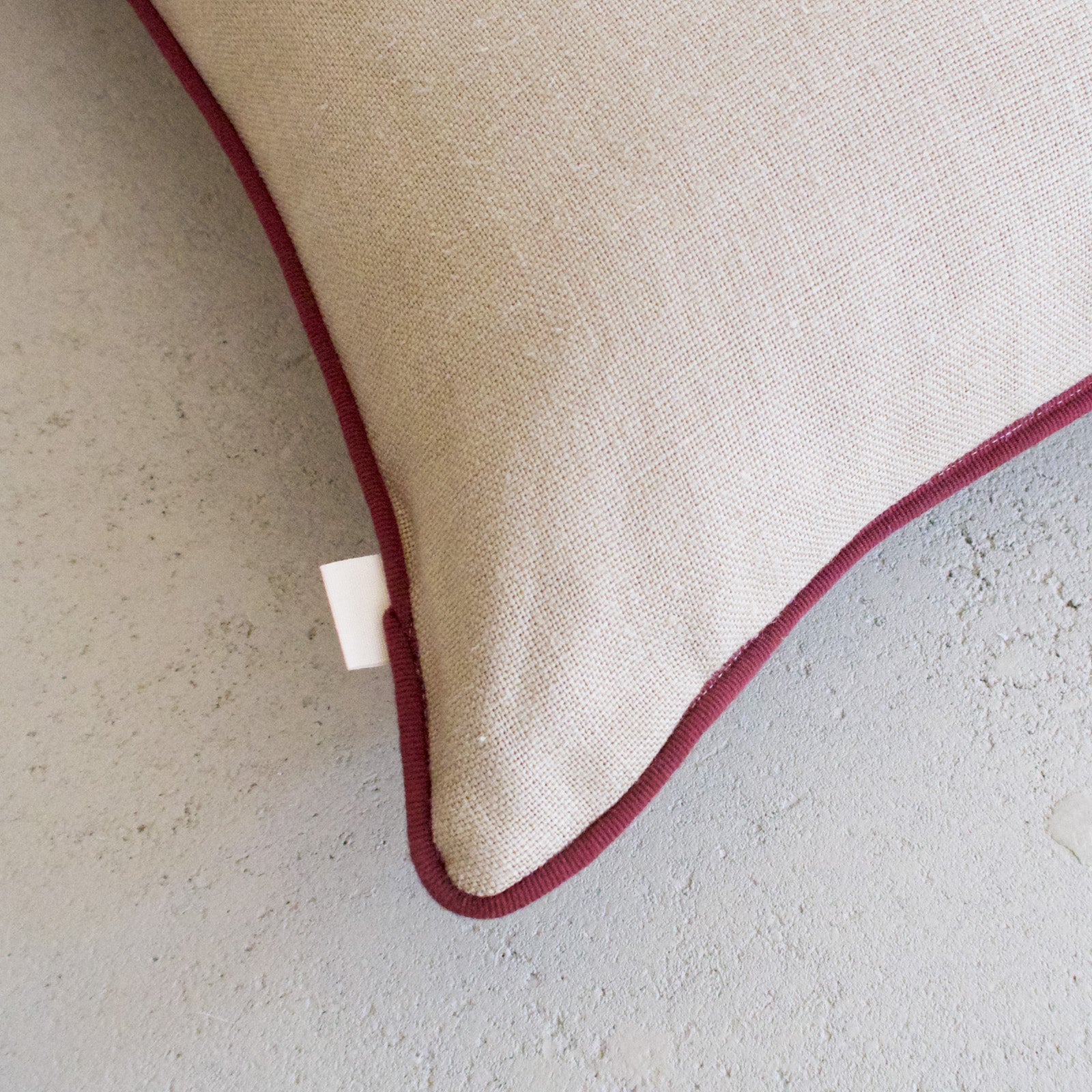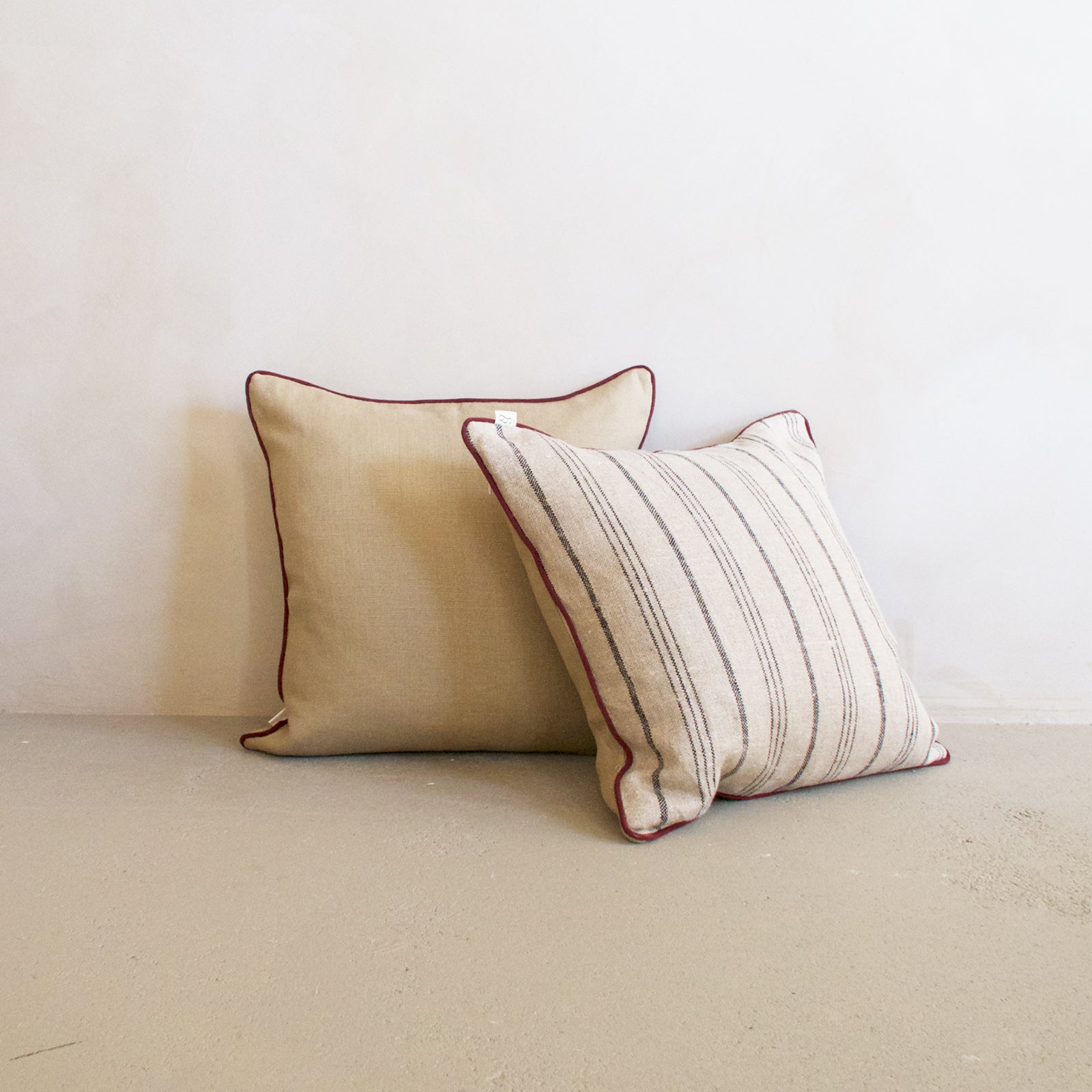 These cushions are made with a unique vintage thick linen/cotton fabric with red piping to the edges of the cushion, filled with a feather inner.